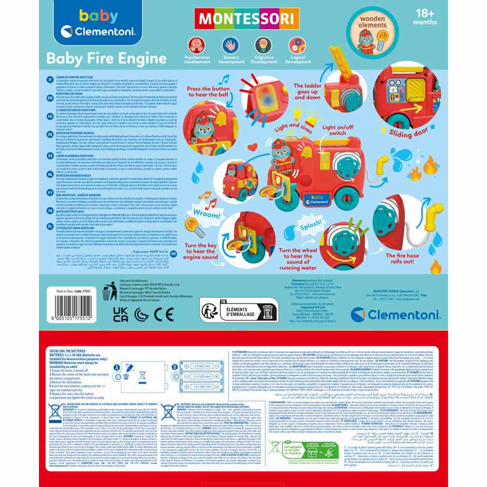 O masina de pompieri care devine un centru de activitati inspirata de metoda Montessori. Setul de joaca stimuleaza abilitatile manuale ale copiilor, determinandu-i sa desfasoare activitati obisnuite si sa faca gesturi de zi cu zi: intrerupator, robinet de apa si cheie. Inspirat de tabla de lucru Montessori si cutia cu incuietori cu piese din lemn. Masina de pompieri devine un set de joaca extensibil cu Casuta pentru bebelusi Montessori de la Clementoni. Descoperiti toate jucariile si jocurile Montessori pentru primii ani de la Clementoni. Produs potrivit pentru copiii cu varsta peste 18 luni.
